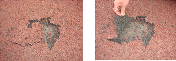 防止塑膠跑道膠面鋪筑后局部發(fā)生起泡脫殼,對于基層密實度要嚴格控制,防止瀝青基礎層自身嵌擠不實,脫殼脫層,致使粘結(jié)力差,表面氣化,膠面被拉斷?;鶎用軐嵍炔粔虻牡胤?,可以采用鉆頭打孔,灌膠(橡膠釘)的方法進行加固。